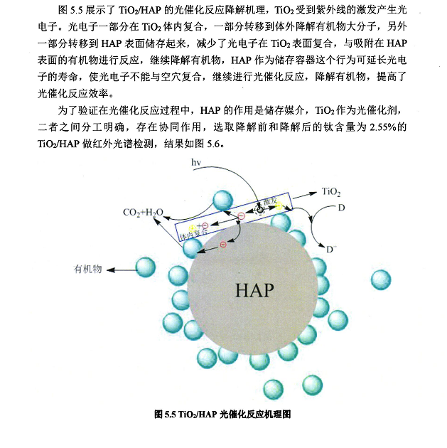 本品通过将掺杂改性红移后的纳米二氧化钛,负载于纳米HAP羟基磷灰石上,TiO2与HAP之间存在协同作用,HAP延长了光电子的寿命,提高TiO2/HAP的光催化效率。